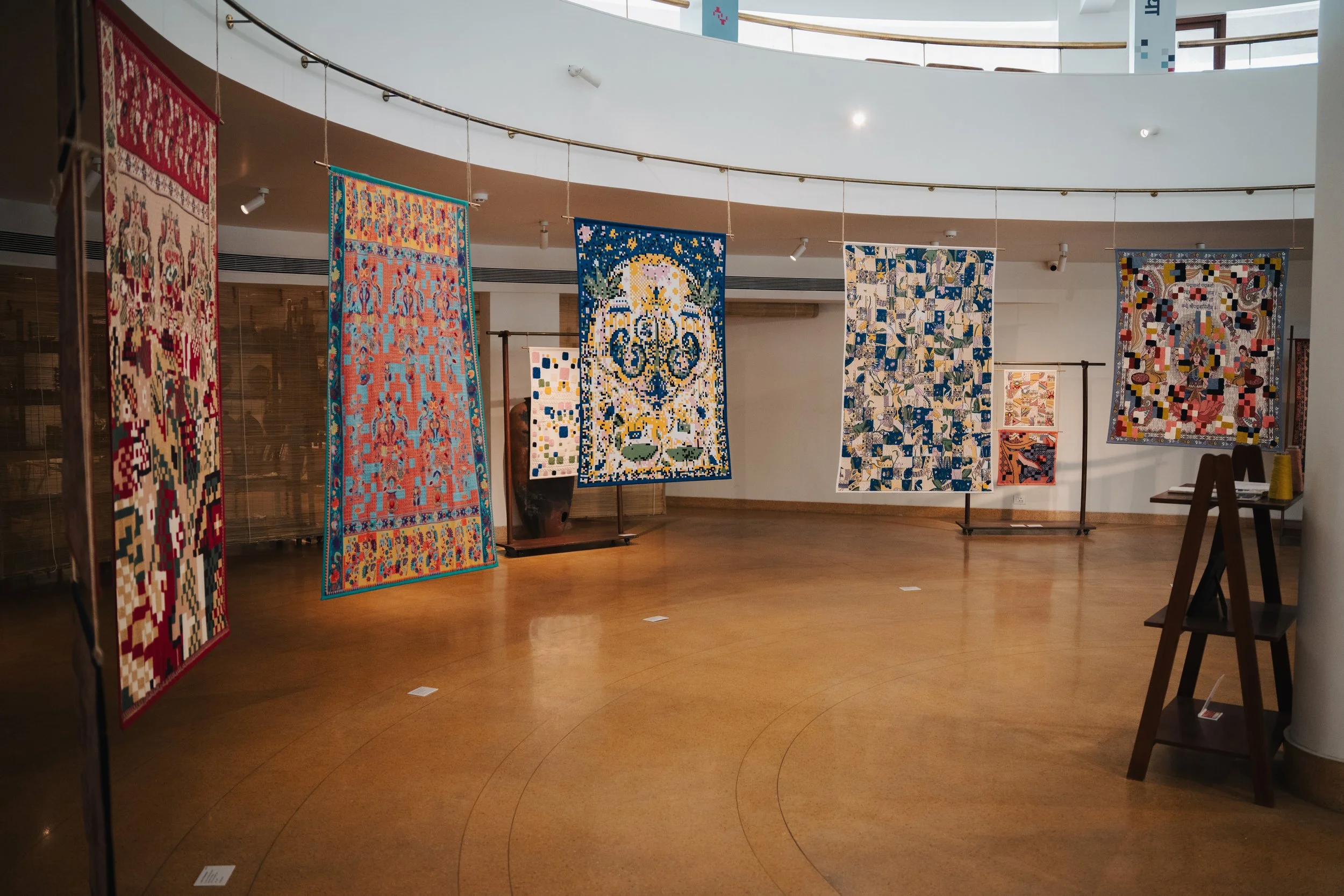 The inquiry begins in the archive: Chintz reveals the lotus in fluid, painterly strokes; Kantha distills it into humble, meditative stitches; Pichwai frames it with devotional grandeur. Ikat disperses it into blurred geometry, while Paithani transforms it into shimmering brocade. Madhubani renders it bold and folkloric, each tradition offering not just a style but a way of seeing.