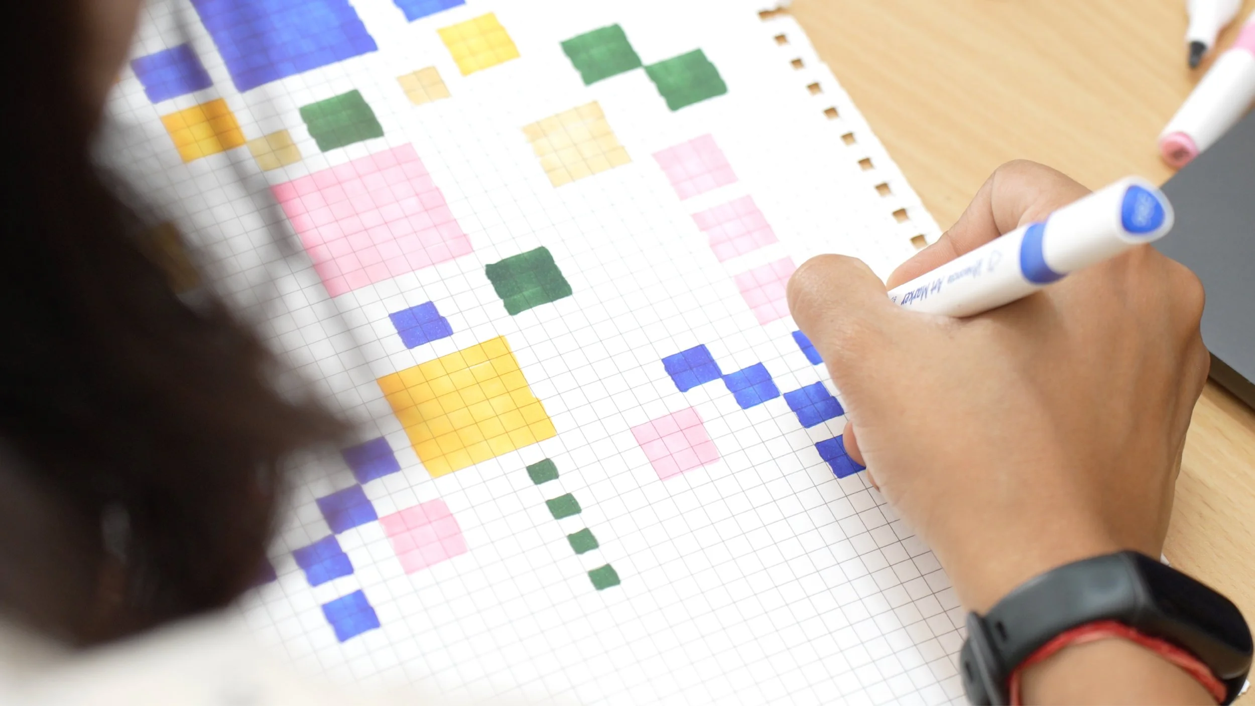 We experiment with the scale of pixel compositions by reimagining small portions of the design as hand embroidery and crochet. This gives rise to textured works that are embedded with both heritage and human touch.